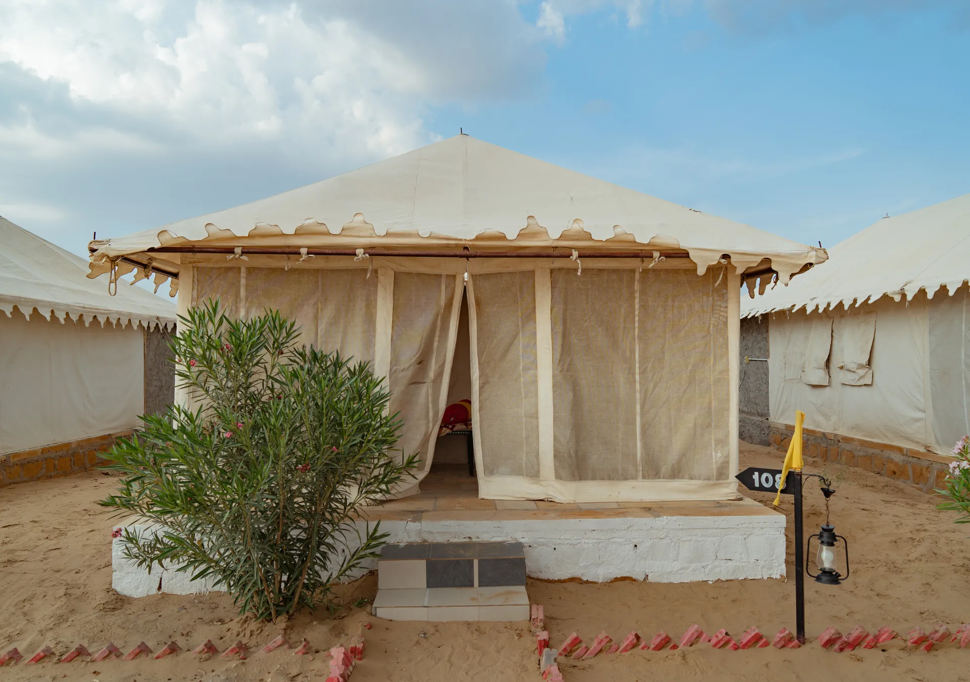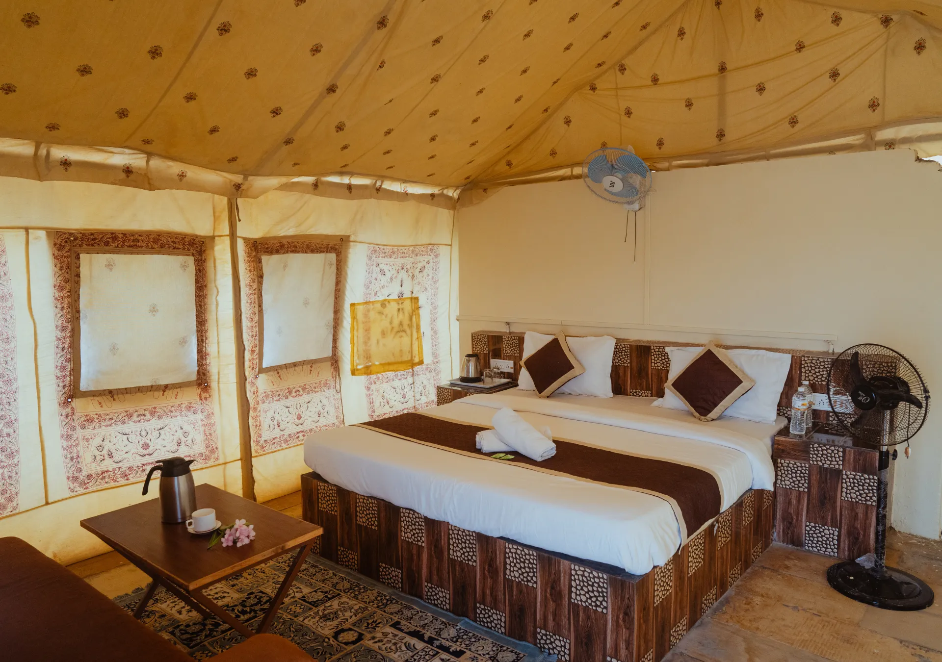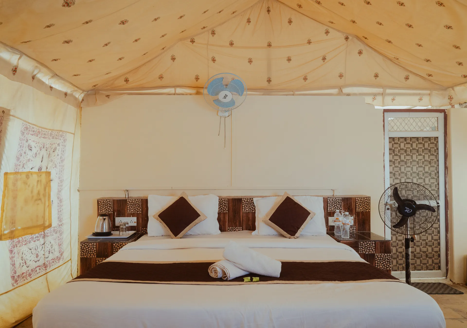Rumis Desert Camp offers a luxurious Swiss tent experience, complete with newly updated amenities and exceptional hospitality. Enjoy the beauty of Jaisalmer with us. Our Swiss luxury camps are spacious and comfortable, featuring large beds for a restful sleep. Additionally, each tent includes a heritage-style balcony, perfect for stargazing and enhancing your stay with us.